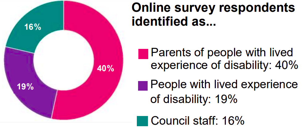 Online survey respondents identified as: 40% Parents of people with disability, 19% people with lived experience of disability, 16% Council staff