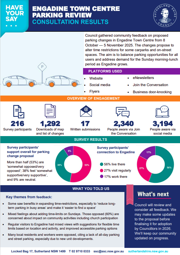We're engaging with residents, businesses, and visitors on these proposed changes with the aim of improving parking availability, and in turn, economic activity and liveability in Engadine.