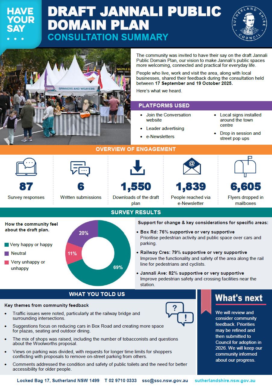 Sutherland Shire Council has been working to improve these spaces through its long-term Public Domain Strategy — a plan that supports safe, welcoming and well-connected places across the Shire. As part of this, the community shared ideas for improving local centres, including Jannali.