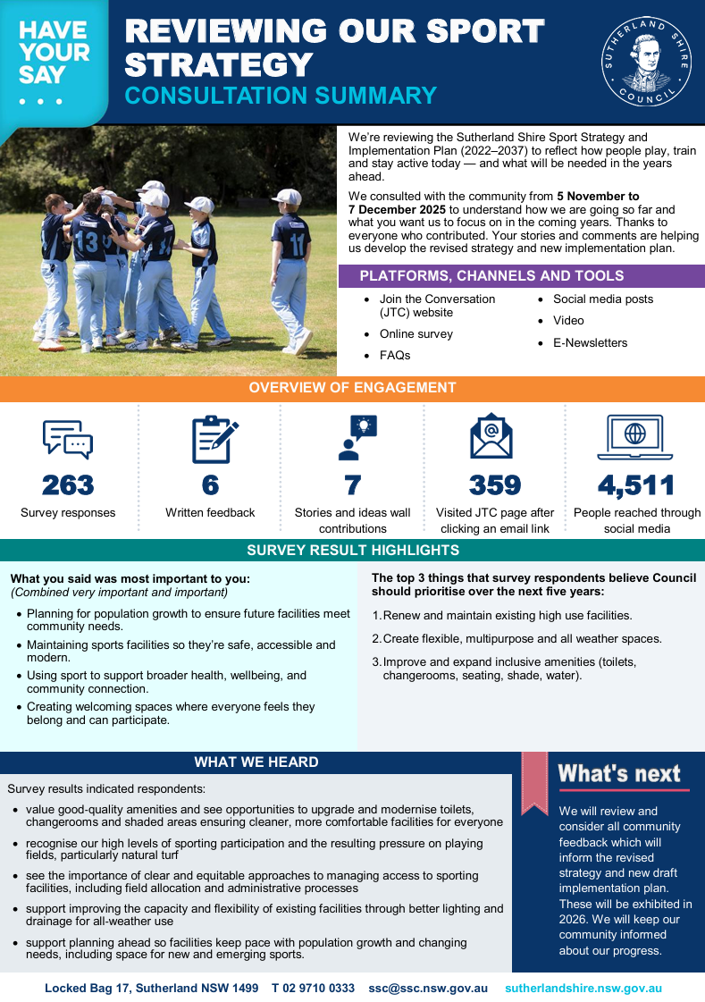 Your stories and ideas help highlight the real impact of sport and recreation across Sutherland Shire and guide our future planning. Check them out below.